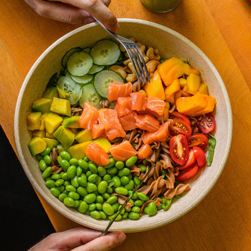 Mix de folhas, atum, cebola roxa, queijo minas, tomate cereja e molho frutaria.